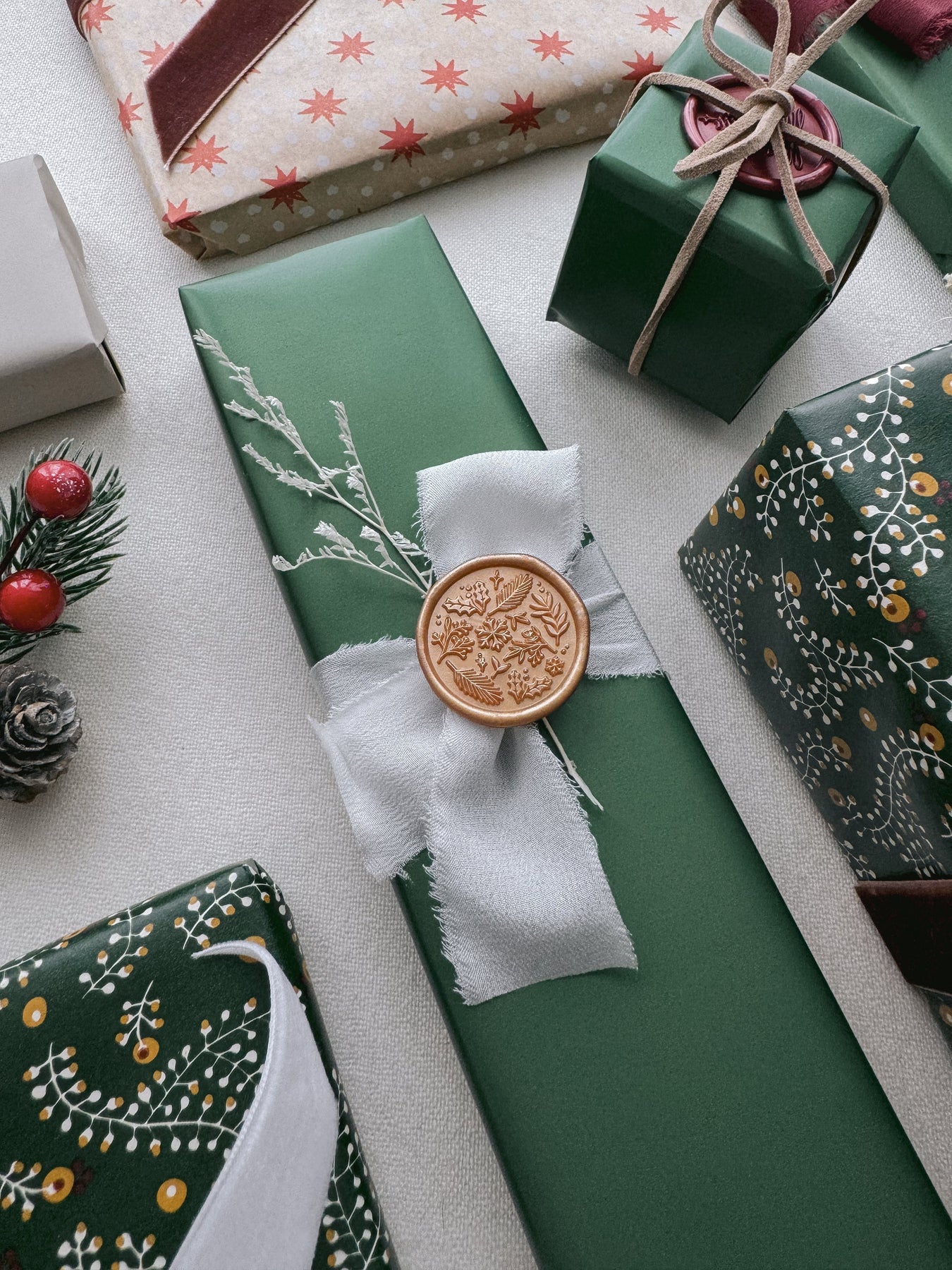 The Winter Garden wax seal stamp features intricate hand-drawn botanical elements and delicate snowflakes. This wax seal is the perfect embellishment for adding a festive, wintery touch to your holiday cards and Christmas gifts this season.