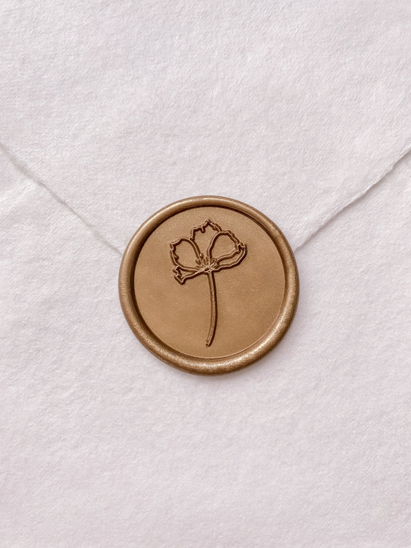 The Flora Wax Seal Stamp is the perfect embellishment for adding a sweet and minimal botanical touch to your wedding invitations, any stationery and projects. It features a lovely hand-drawn flower design that is versatile and complements various wedding themes and occasions.