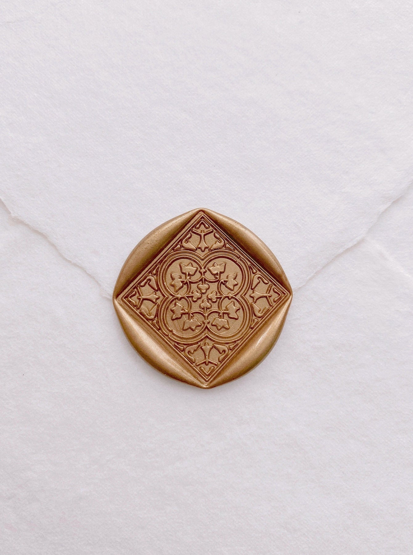 Our Amira Moroccan Tile Wax Seal Stamp will elevate your wedding invitations or any stationery with a touch of sophisticated elegance. Featuring a beautifully engraved quatrefoil design, it is perfect for boho weddings or anyone looking for an exquisite and unique embellishment.