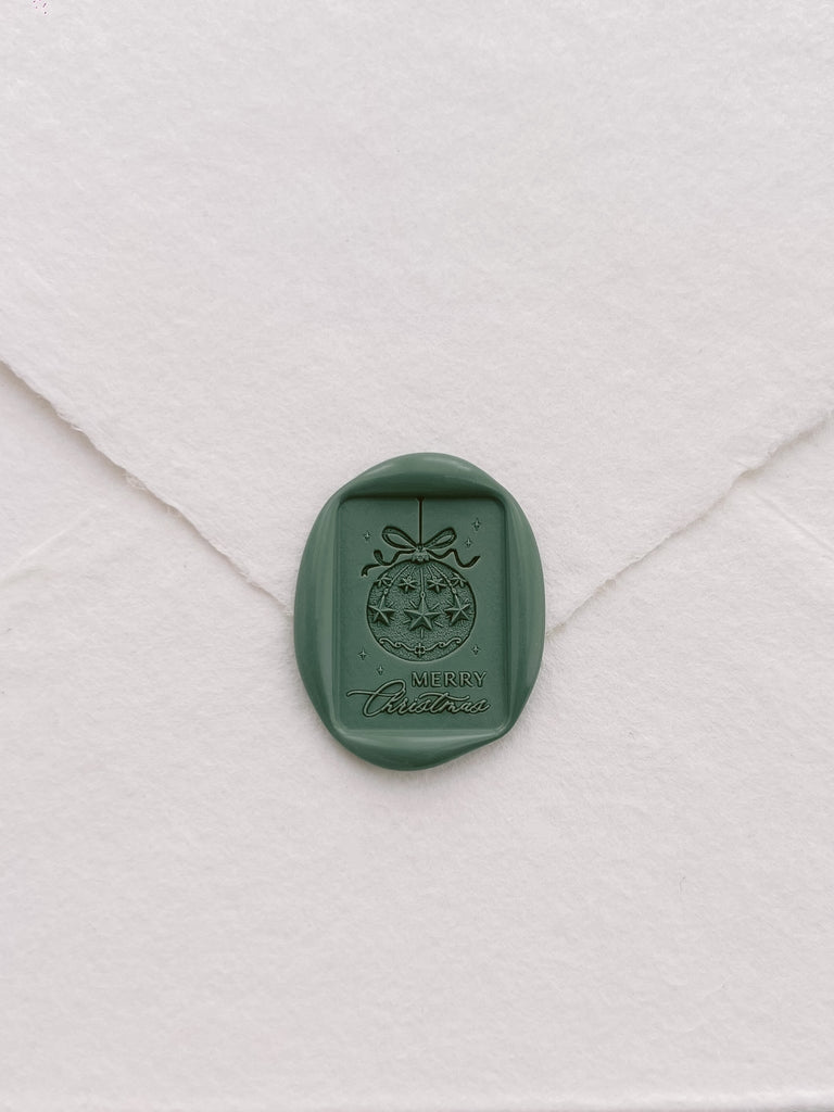 Light sage green festive ornament design wax seal on a wrapped Christmas gift
