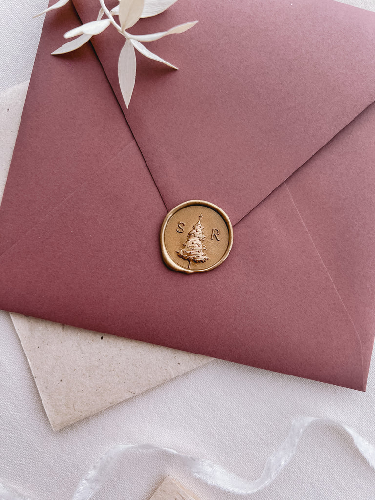 Christmas tree desgin personalized monogram wax seals in gold and green on green and beige Christmas card envelopes
