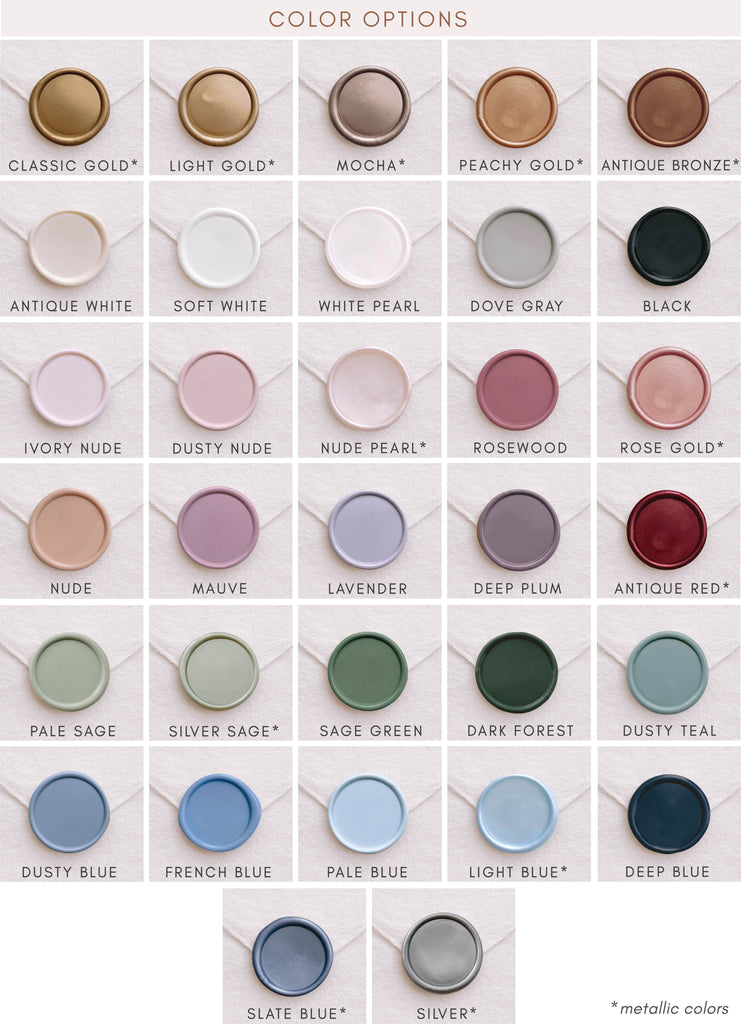 Wax seal color swatch available in a palette of 30 stunning colors to assist you with finding the perfect hue for your wedding invitations, day-of stationery, and creative projects. You will be able to feel the impeccable quality and smooth texture of our sealing wax.